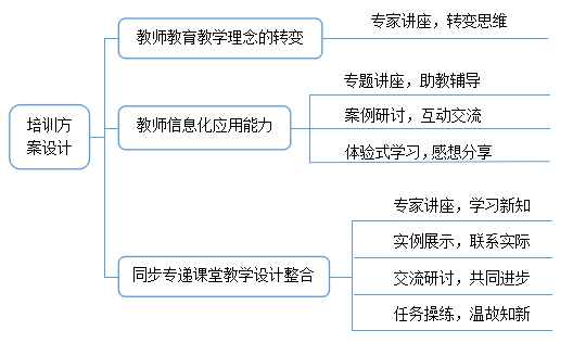 教育信息化的推进为优质教育资源共享,缩小地区之间的差距,促进教育公平等方面提供了强有力的手段。远程同步与专递课堂利用信息化教学手段,能够进一步扩大合作学校间优质教学资源的辐射范围,给更多学校提供信息化教育帮扶以及资源共享,是促进教师协同教学、实现教育均衡发展、优质教育资源最大化利用的创新之举。为了进一步推进同步课堂与专递课堂的广泛实施,保障与提高本地与异地课堂的教学的质量与效果,首当其冲的即是制定全方位的培训计划与方案,以下将主要从培训目标、培训内容、培训设计、培训实施的开展几个方面作详细介绍: